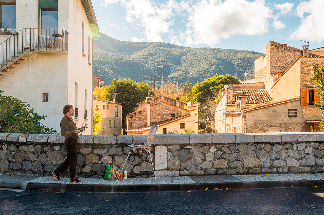 Ilya Komov har ställt upp sitt staffli vid en rondell strax utanför Cérets gamla stadskärna. Vyn över husgavlar vid foten av Pyrenéerna håller på att ta form på hans duk. Ilya kommer från Moskva men har tillbringat mycket tid i Frankrike.