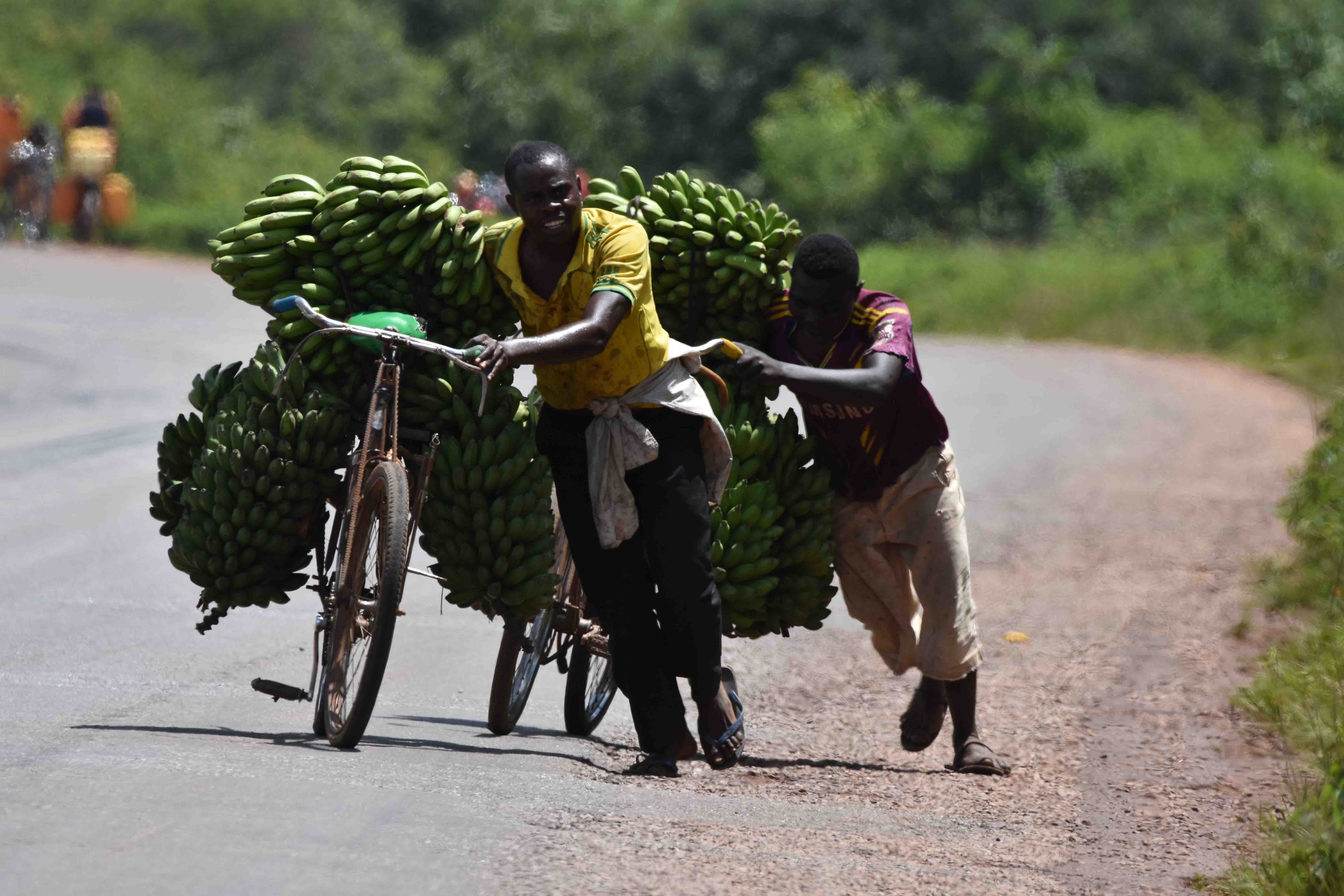 Frukost får vi av en islamsk kvinna som gör omelett och chapati i sitt lilla gatufik, gott. Vi beundrar alla vattenbärare. De fyller sina gula plastdunkar med vatten och cyklar sen, tungt lastade, ut med den dyra lasten till byarna i omgivningarna. Här i Tanzania transporteras bananer, vatten, ja allt på tvåhjulingarna.
