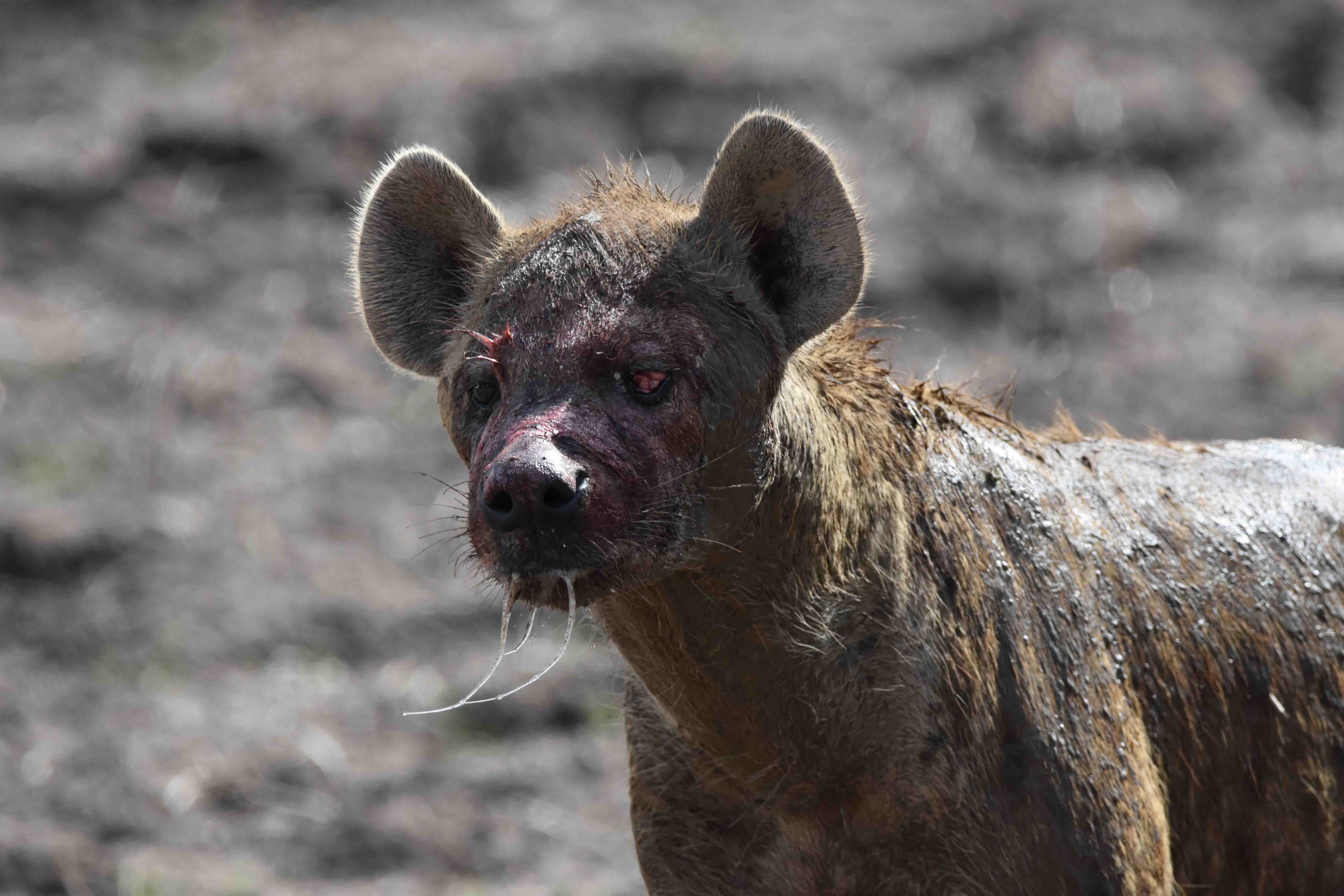 Ett slagsmål mellan hyenor har precis skett. Vi får syn på slagskämparna. De är inga vackra djur dessa hyenor, än mindre efter ett slagsmål.