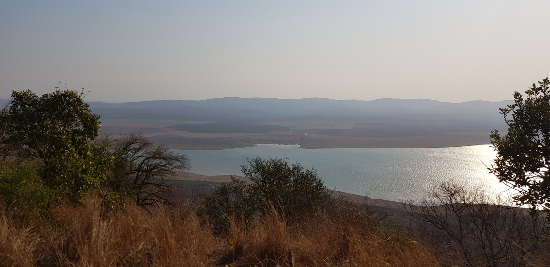 En och annan ko och många getter passerar då och då över vägen. Vi möter mycket trafik. Hemvändande helgfirare? Så ser vi apor och en ensam giraff som dricker vatten ur en flod vid vägen. Äntligen känner vi att vi är i Afrika. Det Afrika vi drömt om. Efter fem timmar lämnar vi huvudvägen. Det går brant uppför. Vi får en bedårande vy över Pongolapoortdammen.