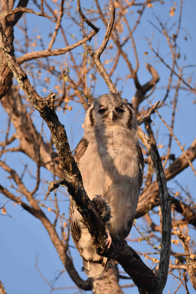 I trädet ovanför vårt rum i Ghanzi upptäcker vi tre jättelika ugglor, ”spotted eagle-owl”. Jag tror först att de bara är attrapper, de rör inte en fena. Men så lägger den ena ugglan sitt huvud på sned och jag rusar iväg för att hämta min kamera.