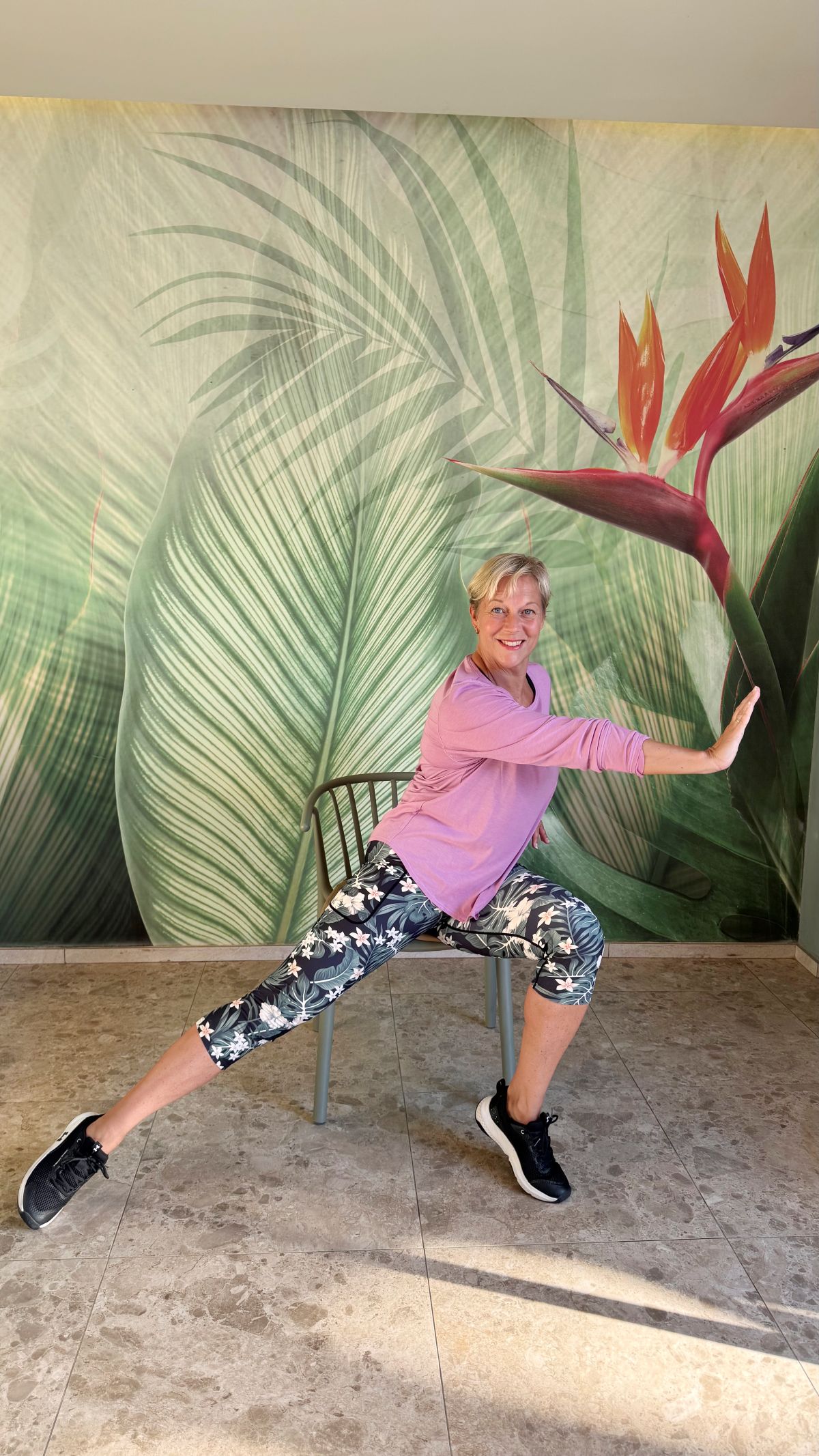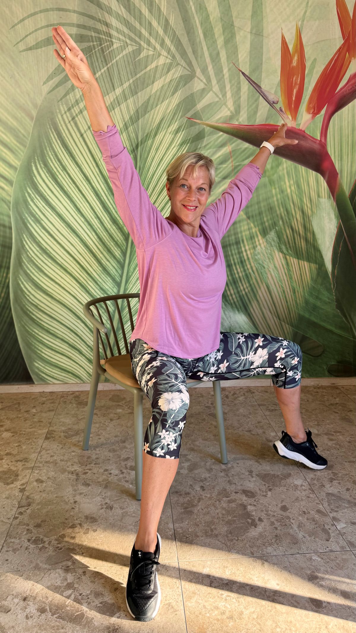 Sitt på stolen och lyft ut båda benen åt sidorna samtidigt som du lyfter båda armarna. Kroppen ska bilda formen av ett X. Dra sedan ihop både armar och ben. Är det svårt att lyfta båda benen samtidigt kan du köra med ett ben i taget.