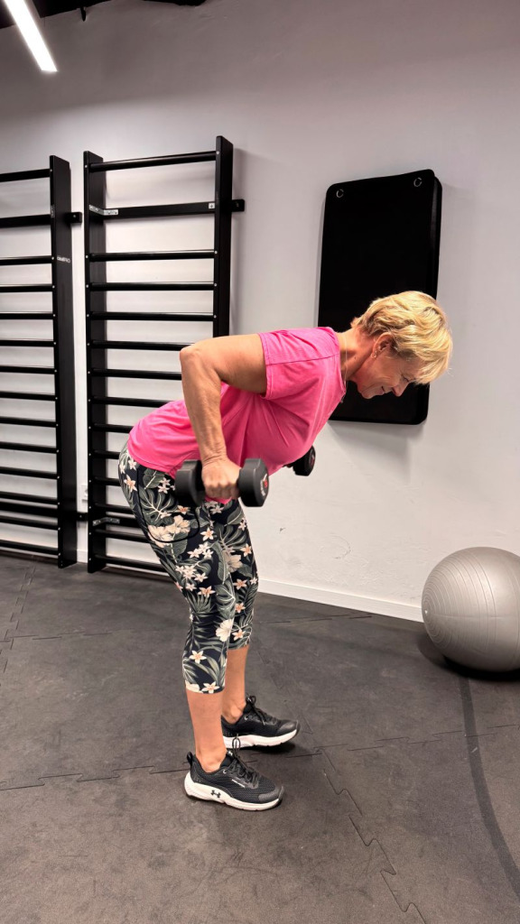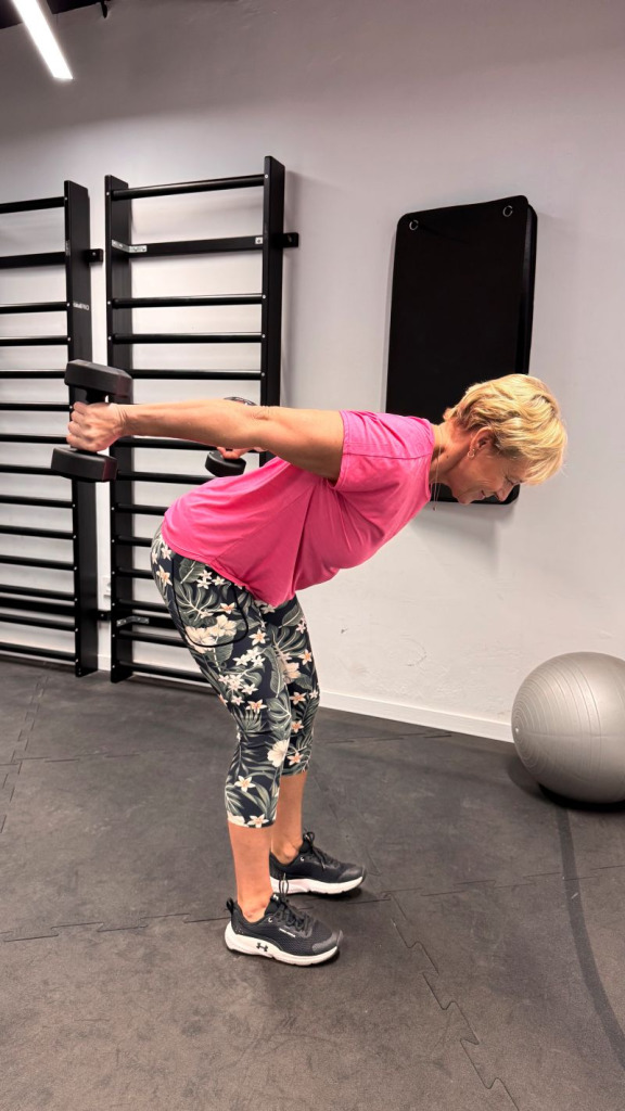 Rodd: Fäll dig framåt med rak rygg och låt armarna hänga rakt ner med vikterna i händerna. Dra vikterna mot midjan och låt armbågarna peka mot taket.