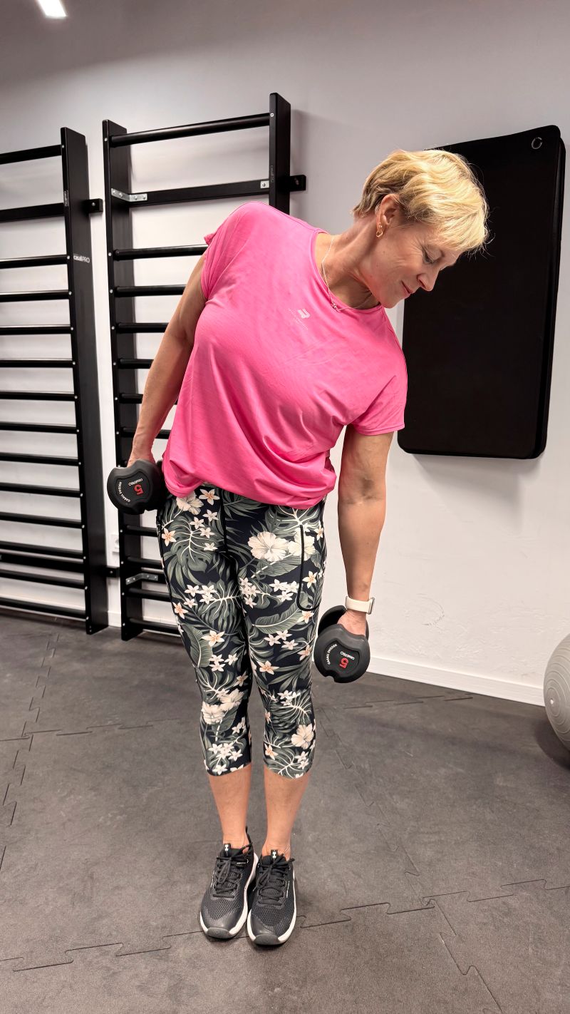 Rodd: Fäll dig framåt med rak rygg och låt armarna hänga rakt ner med vikterna i händerna. Dra vikterna mot midjan och låt armbågarna peka mot taket.