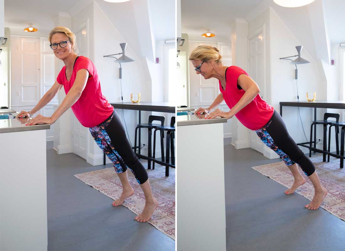 Stå cirka en meter från diskbänken. Axelbrett mellan fötterna. Raka ben. Sätt båda händerna mot kanten på diskbänken. Lite bredare än axelbrett mellan händerna.
