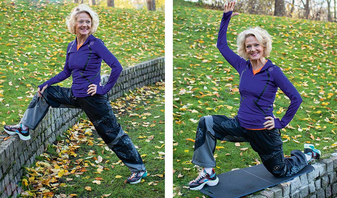 1. Gör övningen då kroppen är uppvärmd, till exempel efter en promenad. Sätt upp ena foten mot en bänk eller mur. Sträva efter att främre benet är vinklat i 45 grader. Det kan du reglera genom att flytta bakre foten/knät försiktigt. Därefter pressar du försiktigt ned och fram underkroppen. Räkna sakta 10-9-8-7-6-5-4-3-2-1. Byt ben och gör samma sak med andra benet.
