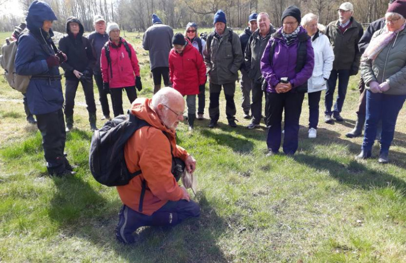 Under sakkunnig ledning av Bert Lindgren gav vi oss iväg. Snart nog fick vi höra fakta om vårfryle och vispstarr. Gulplister hade spridit sig från tomtmark till skogen. Ute på ängsmarken och på kullarna växte desmeknopp, gökärt, svalört, nagelört, knippfryle, vårlök, vitsippa, gullviva, mandelblom i knopp, kungsängslilja, majsmörblomma, styvmorsviol, ängsviol och hässlebrodd.
