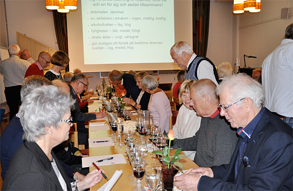 Närmare 50 personer bänkade sig längs långborden när SPF Seniorerna Falun bjöd in till vinprovning på Kristinegården den 19 oktober. Alla hade vi med oss fyra vinglas och ett vattenglas, och på bordet stod skålar med brödbitar. Vinprovningen kunde börja.