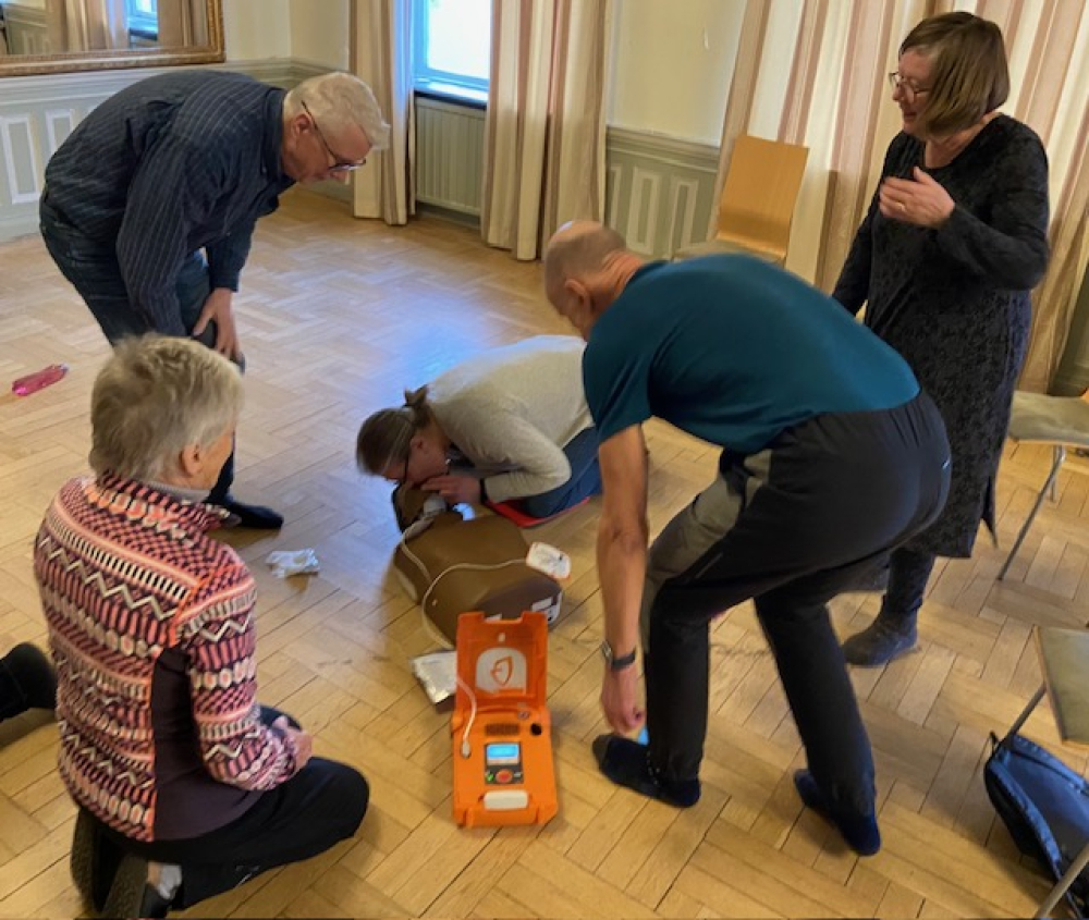 Deltagarna övade också på att kunna utföra hjärt-lungräddning, HLR, på vuxen samt på hur man använder en hjärtstartare.