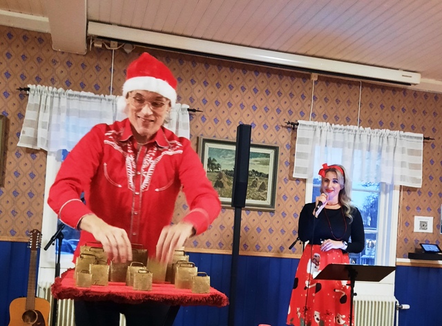 Simon Stålspets och Olga Ulvaroff inledde julfirandet med traditionella julsånger i modernt svängigt framförande. Olga Ulvaroffs proffsiga sång var av mycket hög klass.