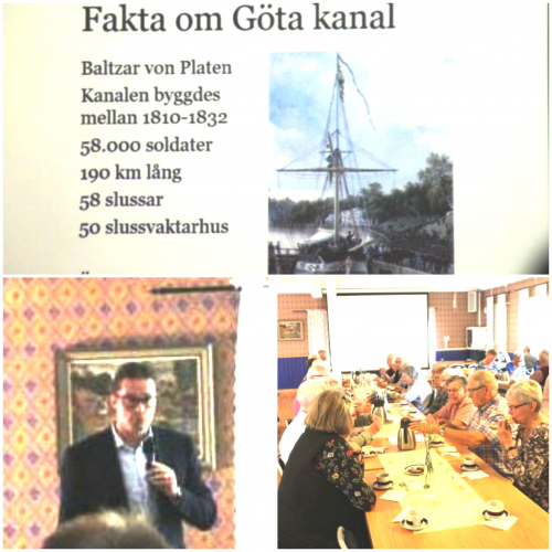 Roger Altsäter började sitt föredrag med att berätta om kanalens historia och kanalens betydelse som turistmål, ca 87% av svenskarna känner till Göta Kanal inte minst genom filmerna, unikt mycket.