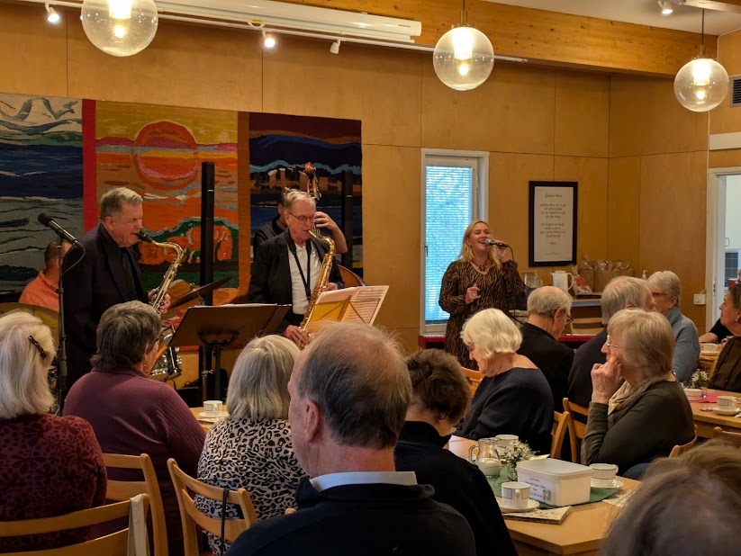 Vår ordförande Inger Frisk hälsade oss välkomna och presenterade dagens underhållare, som var gruppen Swinging Six. De är fem musiker samt en vokalist som under Björn Kullnes ledning underhöll med främst 50- och 60-talsmusik. Det var en mycket igenkännande musik som uppskattades av publiken, och det var många som gärna tagit en svängom.