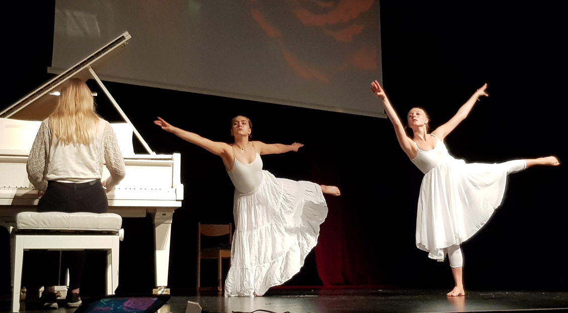 Alexander, Gabriella, Vanessa, Simon, Claudia och Maja spelade filmmusik på den vita flygeln samtidigt som det visades effektfulla bilder på filmduken. Dansgruppen ”Sorry no name” ackompanjerad av Emilia framförde mycket skickligt ett antal danstycken med olika tempon.