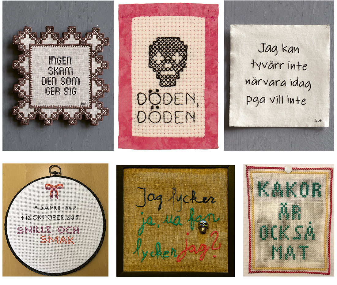 I Giselas fall har broderiet dessutom lett till något hon idag kan försörja sig på. Hon trycker sina tankeväckande broderade ord och säljer dem via sin hemsida www.broderauttexten.se. Det går också att se fler av hennes alster på Facebook och Instagram, under samma namn: broderauttexten.