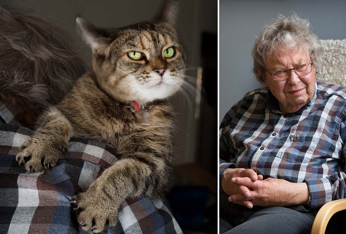 – Ja, det vet jag alltför väl, vem som väcker vem! I morse kom hon in vid fyratiden. Då hoppar hon upp i min säng och nosar mig i ansiktet. Ibland kryper hon ner längst ned i sängen och ibland tar hon fram klorna. Det tycker jag inte om. Men i det läget är vi ändå väldigt jämställda. Jag ligger med huvudet på huvudkudden och hon sitter och bokstavligt tittar ner på mig.