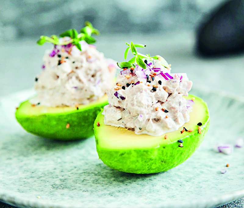 4 Fördela tonfiskröran i avokadohalvornas gropar. Toppa med färska örter och sesamfrön. Njut av jordens godaste och lyxigaste snabbmiddag!