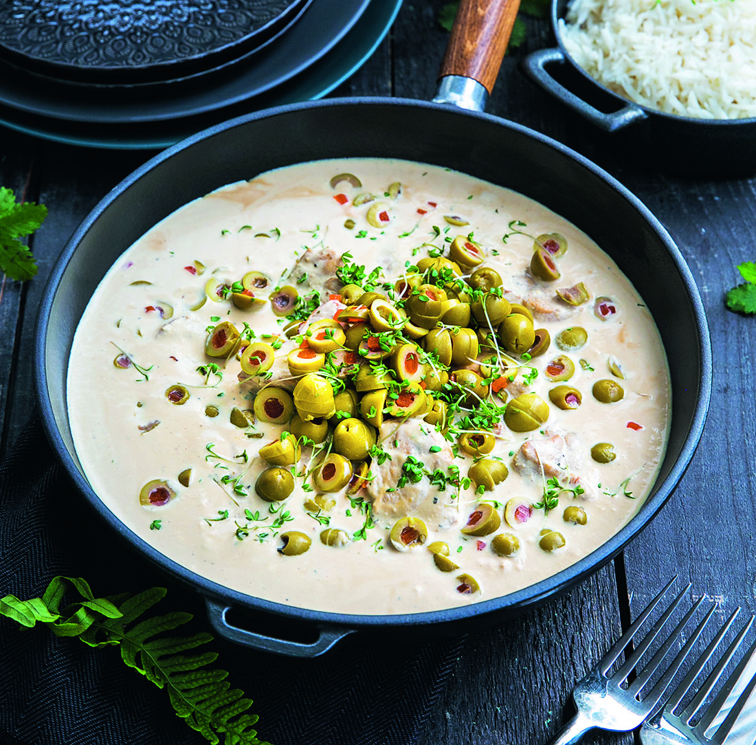 Denna festliga fläskytterfilégryta serveras med ris eller pasta och några salladsblad.