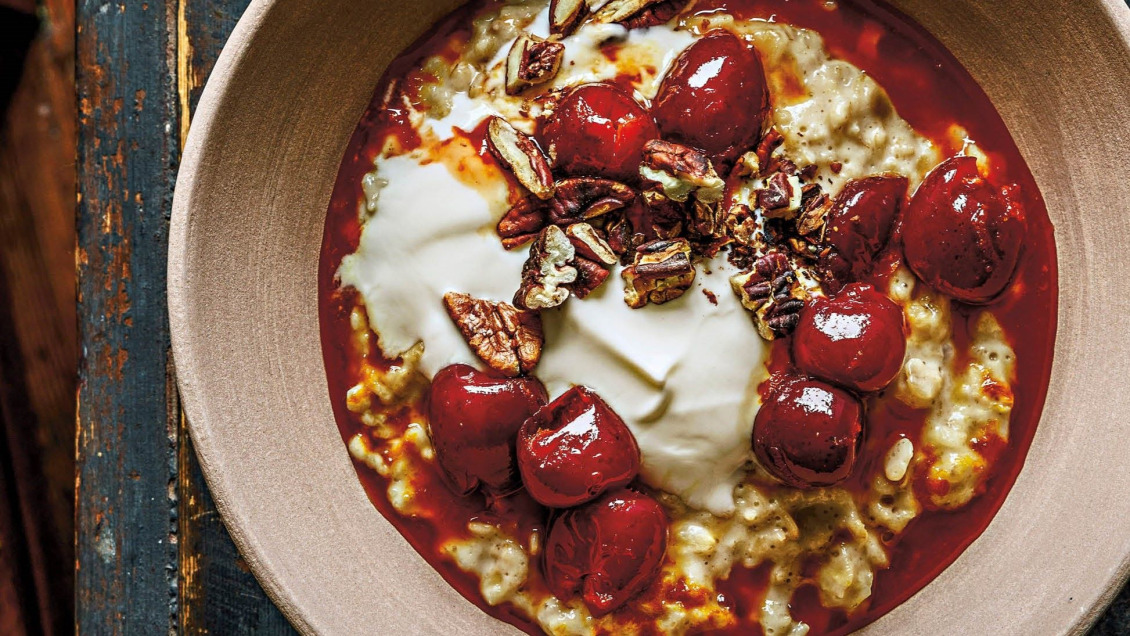 Revansch for havregrynsgröten! Krämig, toppad med yoghurt, körsbär som värms med apelsin samt knapriga pekannötter.