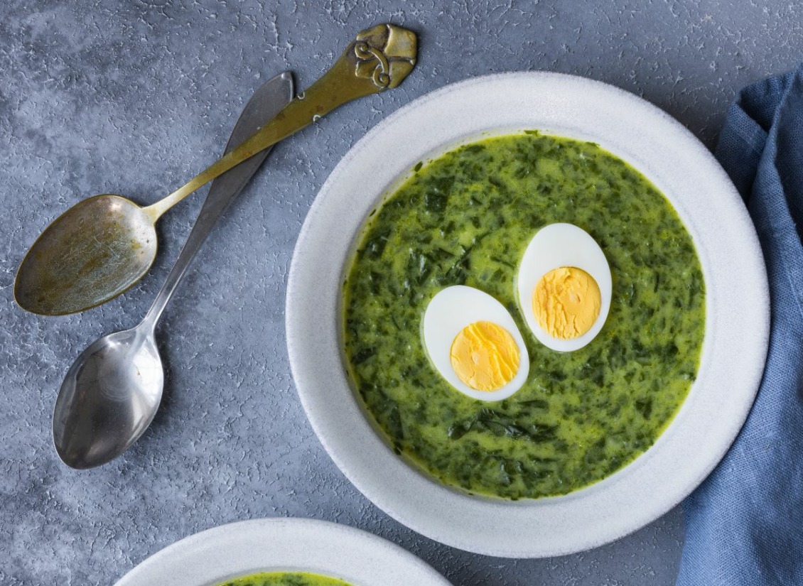 En varm grön soppa maxad med nyttigheter värmer kropp och själ. Ägghalvorna blir pricken över i.