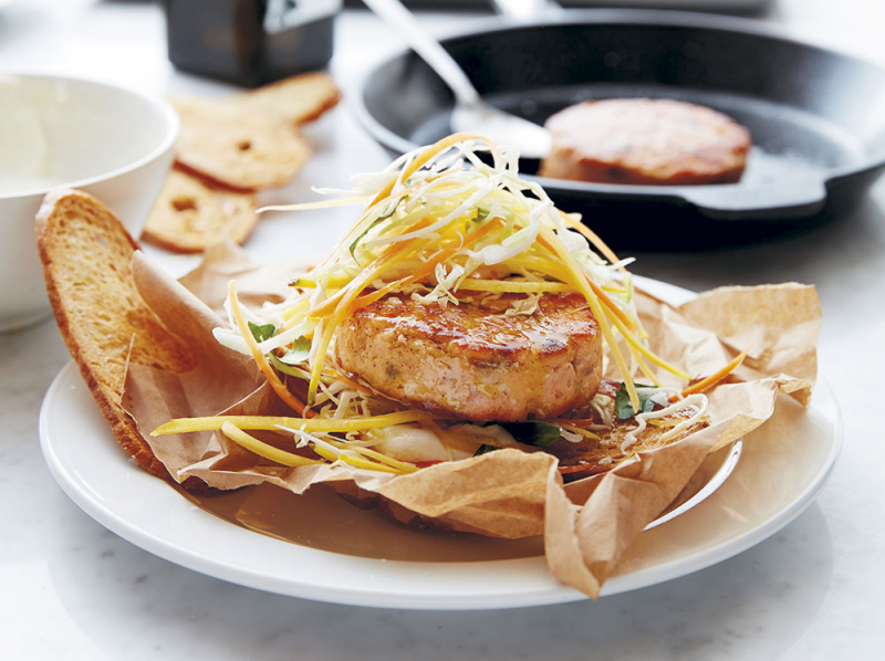 Goda laxburgare stekta i smör och olivolja serveras i rostat surdegsbröd. Laxburgaren toppas med persilje- och vitlökskräm samt kålsallad.