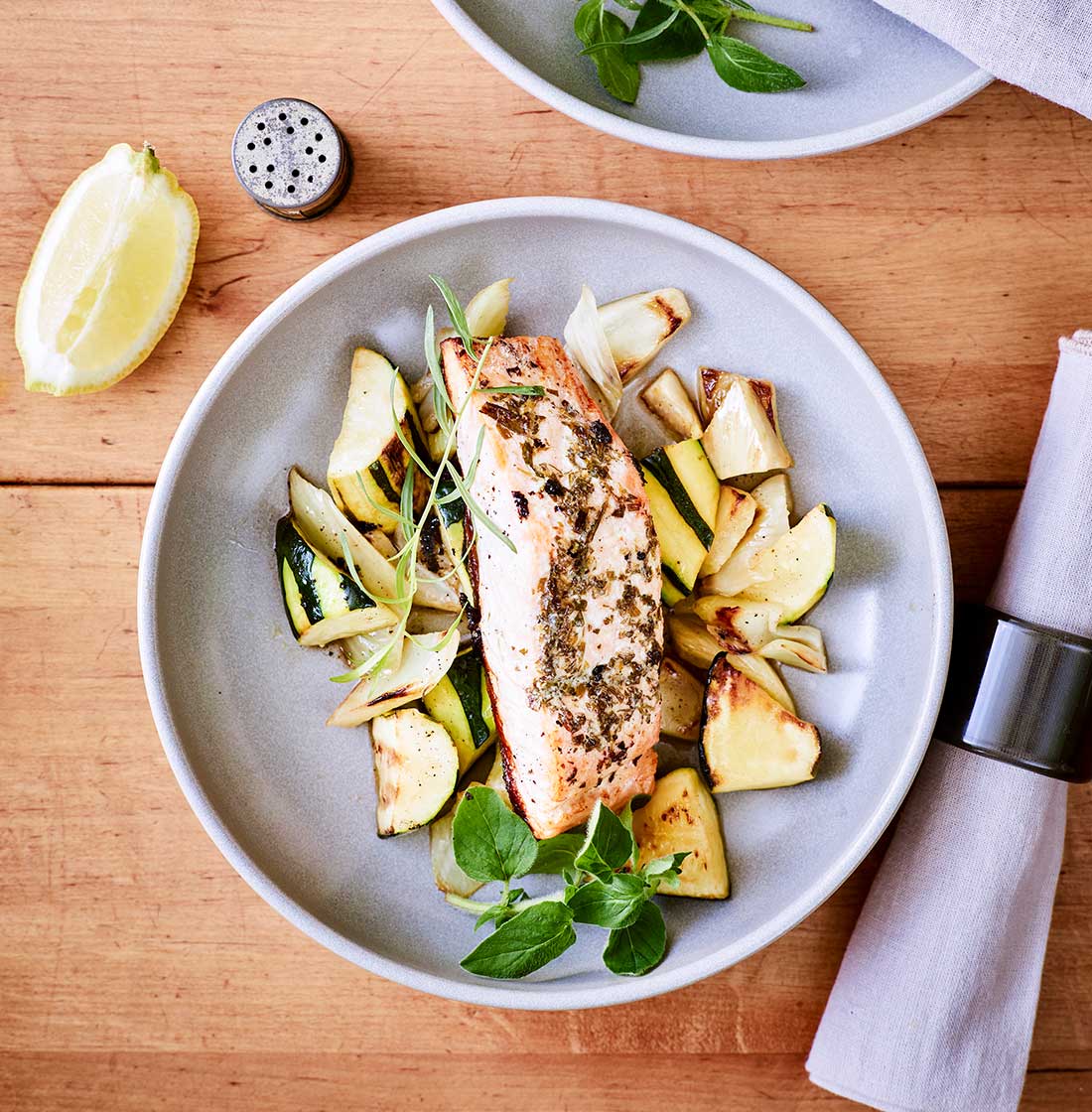 6 Bred örtsmöret över laxfiléerna och lägg i med den förgräddade zucchinin och fänkålen. Baka i ytterligare 20 – 25 min.