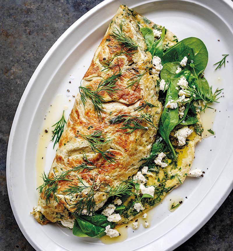 2. Hetta upp oljan i en stekpanna, häll i omelett-smeten. Rör med en gaffel tills omeletten stannat i kanterna men fortfarande är krämig. 3. Lägg bladspenaten i en bunke. Tillsätt citronskal, citronsaft, olivolja och fetaost. Krydda med timjan, salt och peppar.