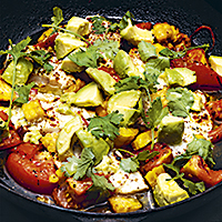4. Ta ut ur ugnen, häll över limejuice och lägg på avokado. Toppa med koriander.