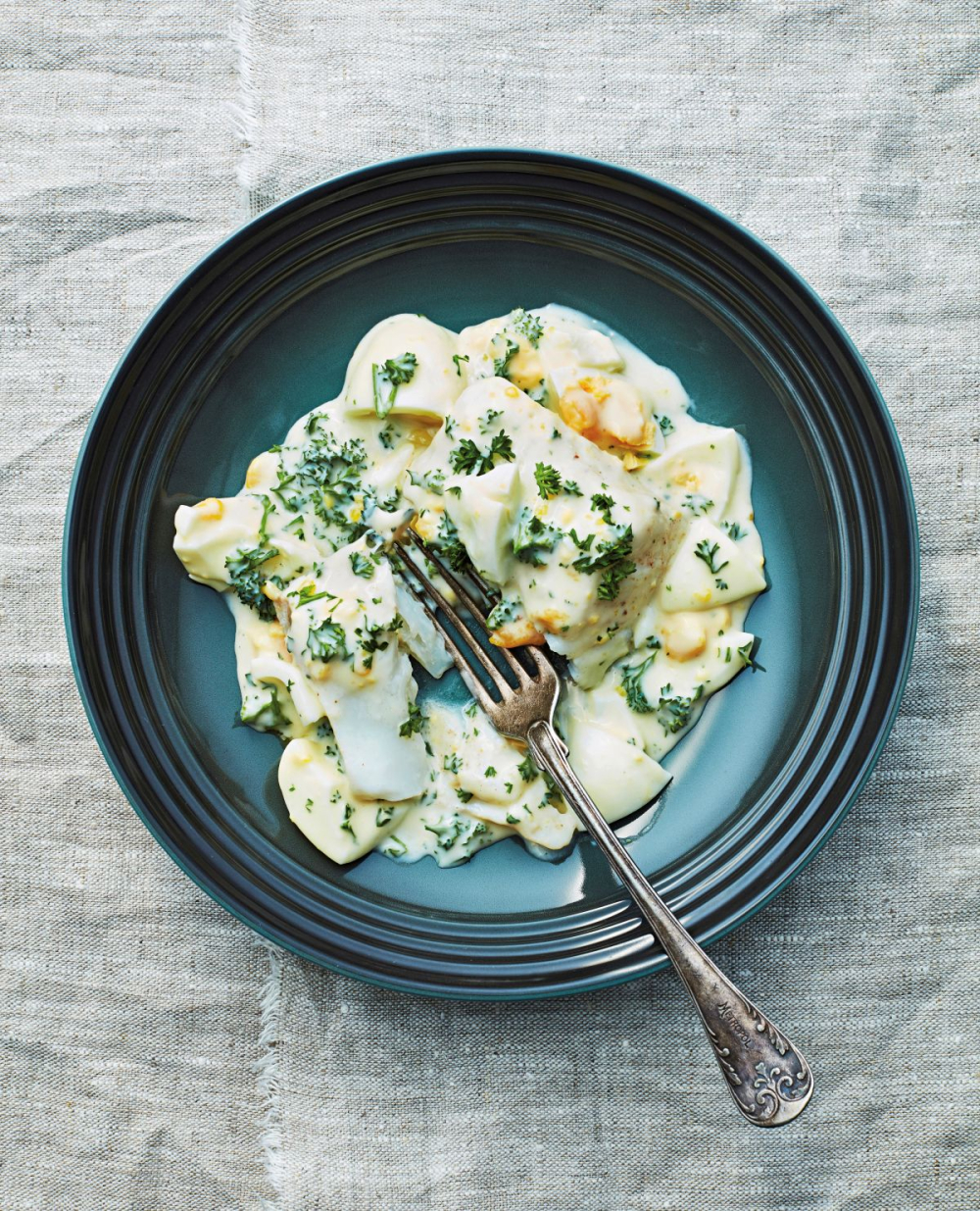 6. Smaka av med salt och peppar. Vänd ner ägg och persilja.