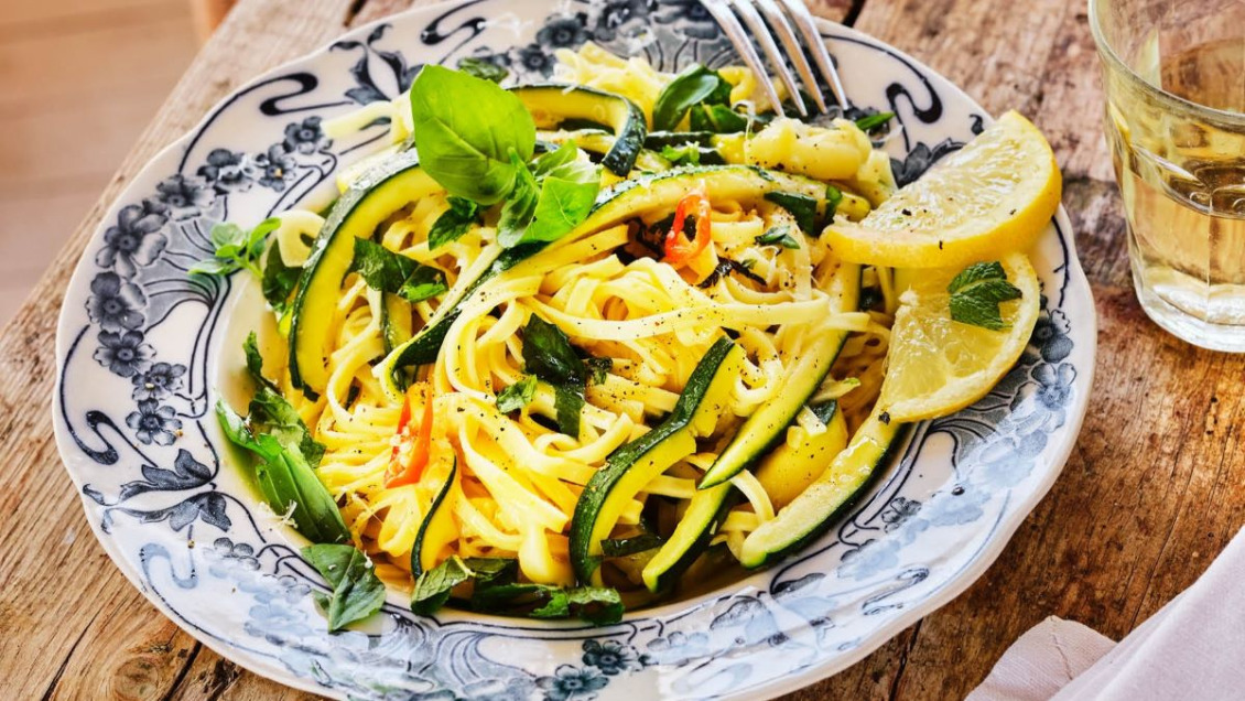 - Koka pastan i välsaltat (med vanligt salt) vatten tills den är al dente. Spara en mugg av kokvattnet och låt resten rinna av. Häll ner pastan i stekpannan. Tillsätt lite kokvatten, mynta och basilika, rivet skal och saft från citronen samt parmesan. Rör om kraftigt.