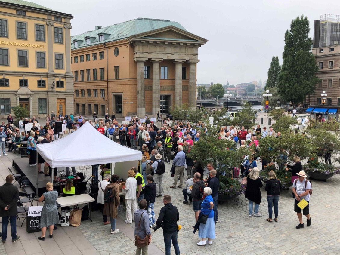Närmare 300 deltagare hade samlats denna sensommarvarma septemberdag under plakat och paroller för att visa att man också kräver ”full återbetalning med ränta” – inte bara ”kompensation” – för det för höga skatteuttag som riksdagen i maj 2022 beslutade att ta ut på 57-ornas pensioner under 2023.