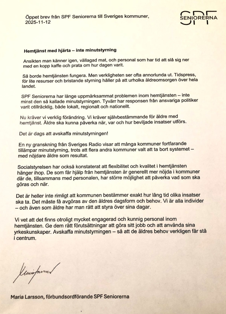 Det öppna brevet skickades till samtliga kommuner under onsdagseftermiddagen (12/11). Under rubriken ”Hemtjänst med hjärta – inte minutstyrning” beskriver SPF Seniorerna hur man ser på hemtjänstens kris: