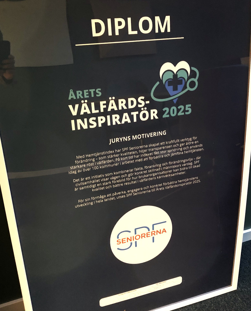 SPF Seniorernas Hemtjänstindex har utnämnts till Årets Välfärdsinspiratör.