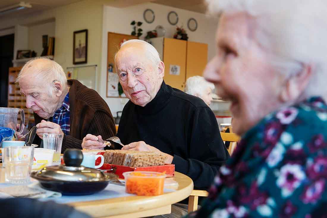 Samtalet vid bordet kretsar kring allt från trav, som flera på boendet är intresserade av, till gemensamma bekanta och släktingar. Det är tydligt att lunchen fyller en viktig social funktion. Efter någon timme börjar de första bryta upp och gå in till sig. Middagen brukar de flesta ordna själva och då blir det gärna något enklare.
