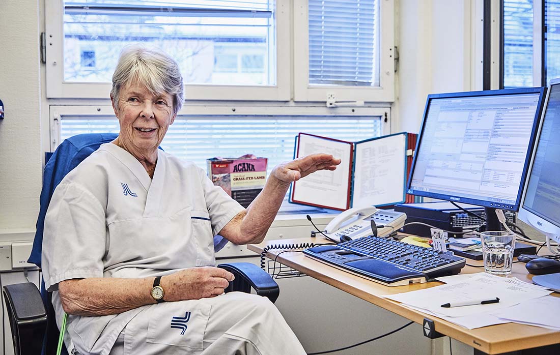 Eva är 76 år och sjuksköterska. Men väljer att jobba vidare, åtminstone på deltid.